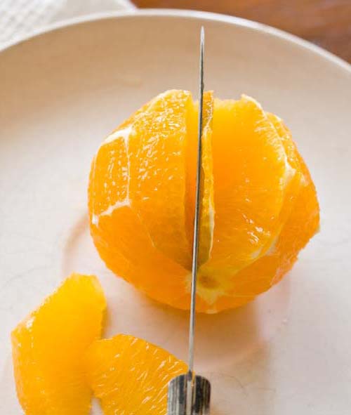 - Elimina la piel de la naranja y hazle cortes transversales a la dirección de los gajos, sin deshacerlos. La idea es que suelte todo el zumo posible sin exprimir la fruta. Así este mezclado con el aceite dará ese sabor espectacular.