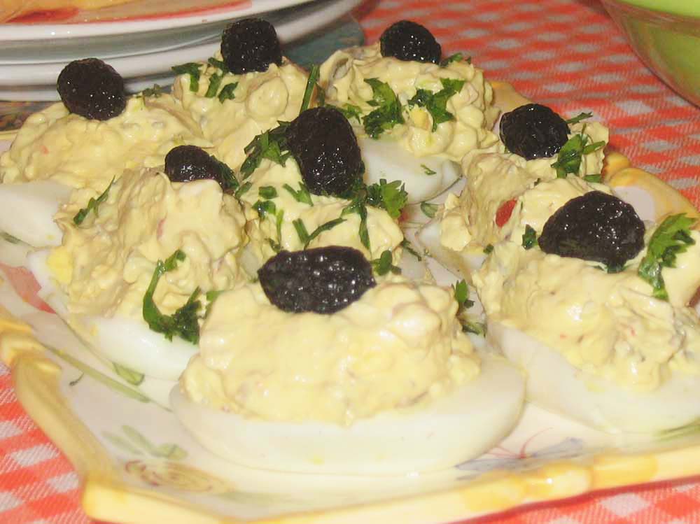 Si gustas puedes adornarlos con el resto de las yemas picaditas y con las gambas o los langostinos cocidos o a la plancha.